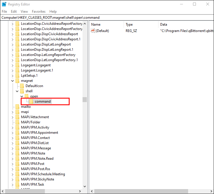 - The registry editor will now open in a new window. Scroll to the file location: \Computer\HKEY_CLASSES_ROOT\Magnet\shell\open\command