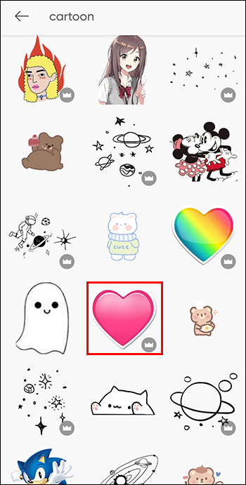 - Type in “Cartoon” or similar to find cartoon-like stickers.