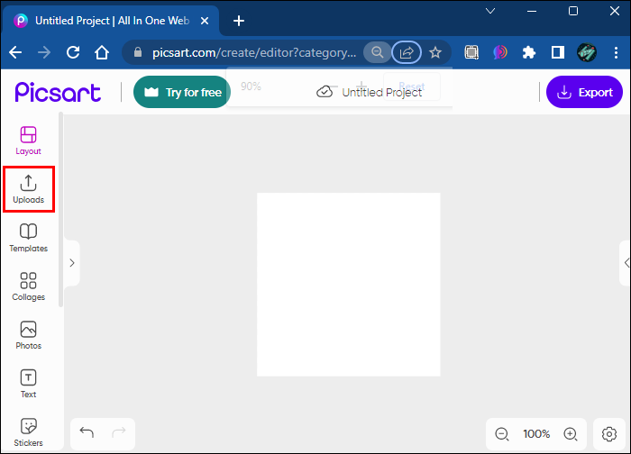 - Go to Picsart’s web editor.