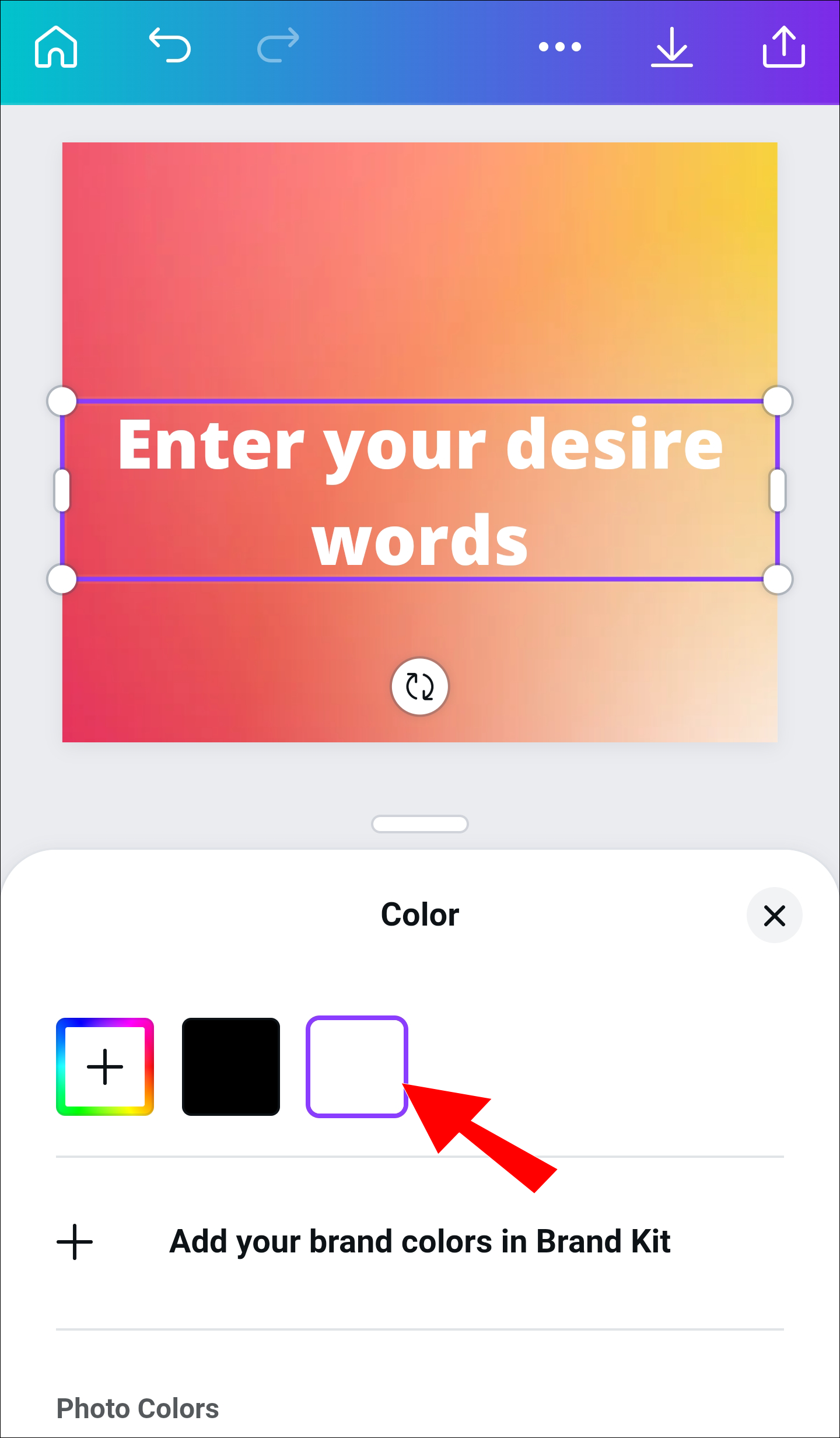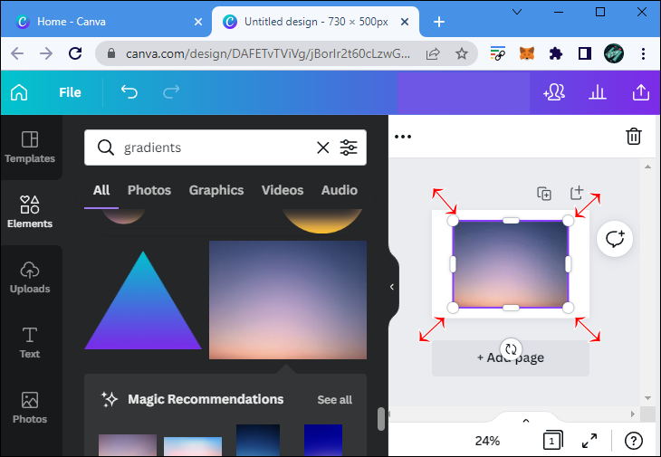 - Click the gradient to see its colors appear in the top-right of your Canva window. Choose your preferred color combination.