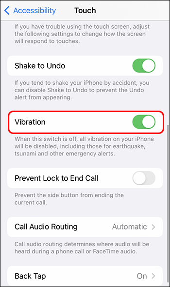 - Turn on Vibration in the “Vibration” section.