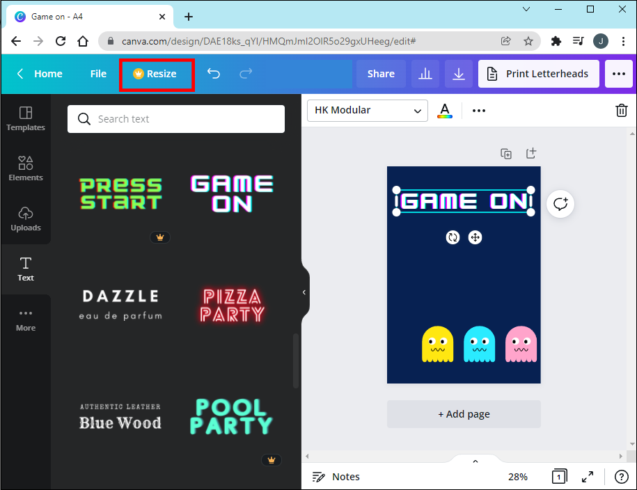 - Above the editor, click “Resize.” The design dimension will be “Custom size” by default.