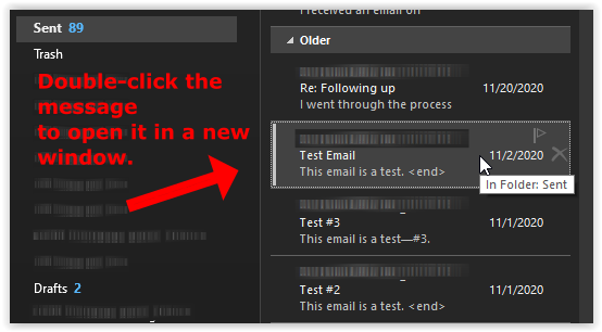 - Double-click the message you’d like to recall from within the adjacent pane (messages pane). This action opens the message in a separate window that presents different options at the top.