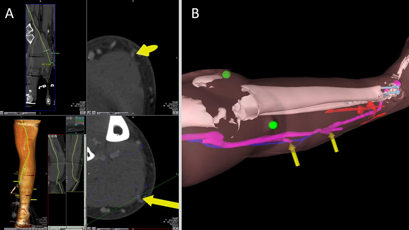 (CTA imaging showing the location of perforating artieries with yellow arrows. Credit: Imperial College)
