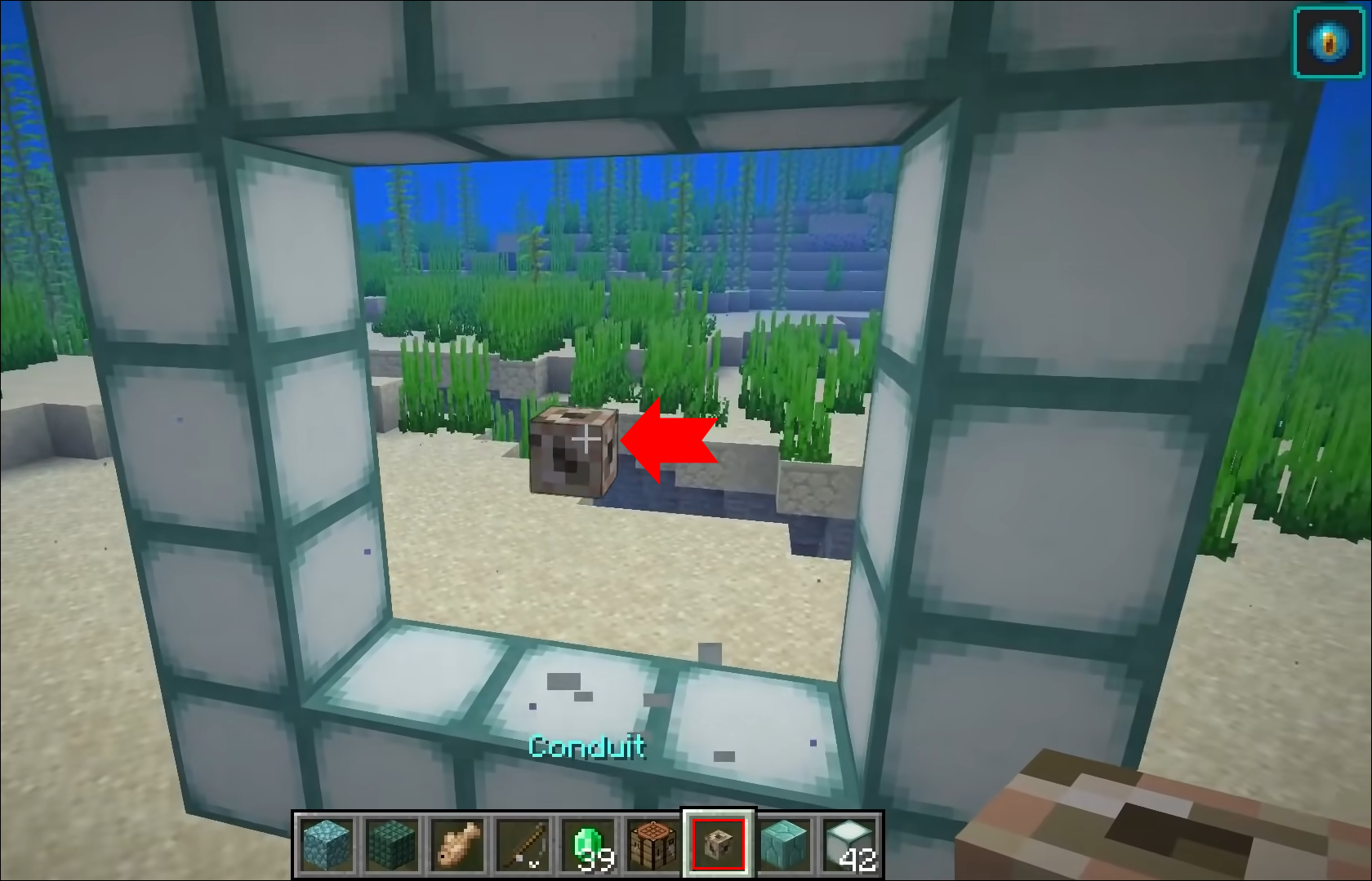 Afterward, you’ll need to craft your Conduit Housing using around 57 Prismarines. This number should help you build enough fields to house and activate your Conduit. Take the following steps to make a Conduit Housing: