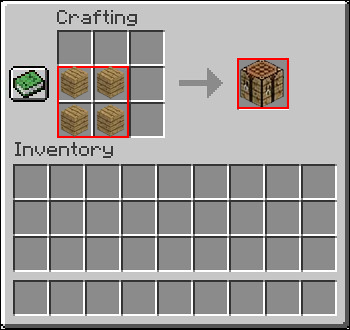 - Put the Planks into each box of your crafting grid to produce your Crafting Table or form a square on the crafting grid.