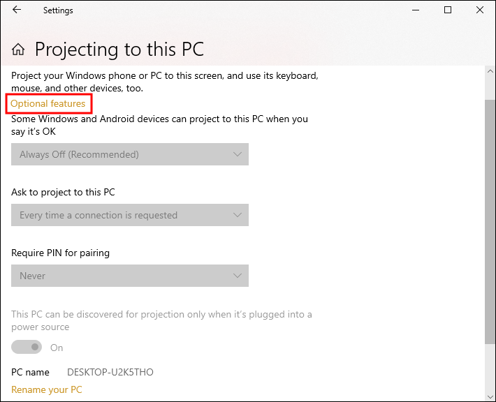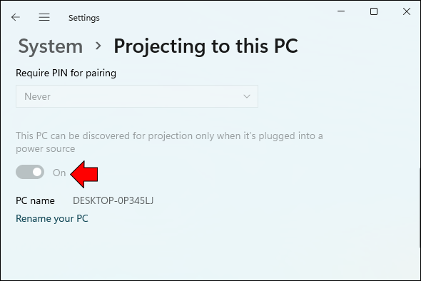 - Under the Projecting to this PC section, specify your projection settings as you prefer. Just ensure you turn off the toggle that says your computer can only connect to a wireless display if connected to a power source.