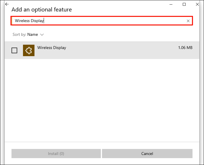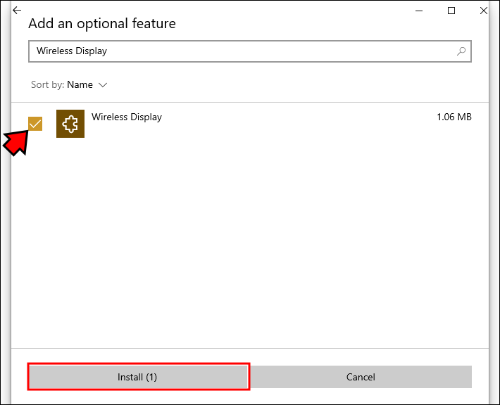 - From the results, check the box against Wireless Display and tap the Install button.