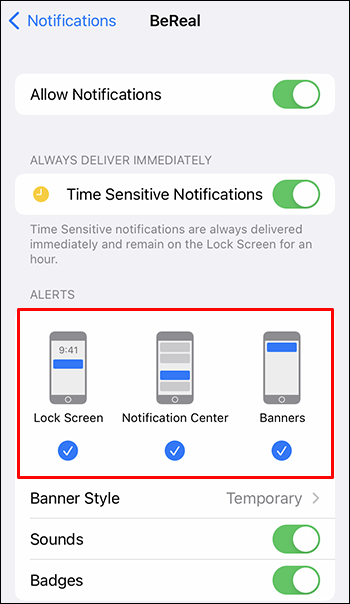- Scroll down to “Alerts” and tap the “Lock Screen,” “Notification Center,” and “Banners” icons so they have check marks underneath them.