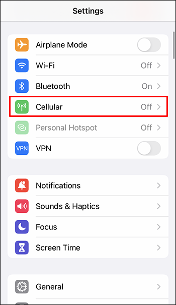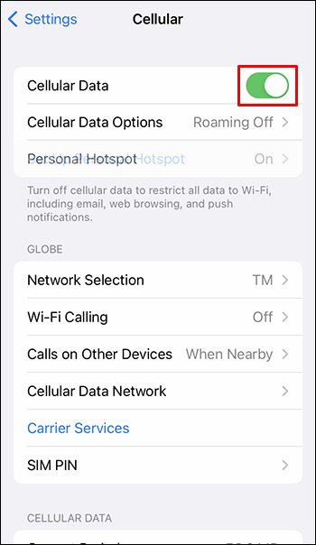 - Use the “Cellular Data” toggle to turn your mobile data on or off.