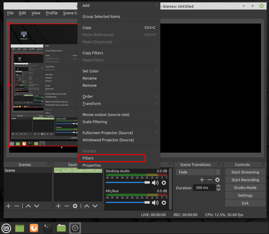 - Scroll back down to the “Sources” box and right-click to access a pop-up menu. From the list of options, choose “Filters.”