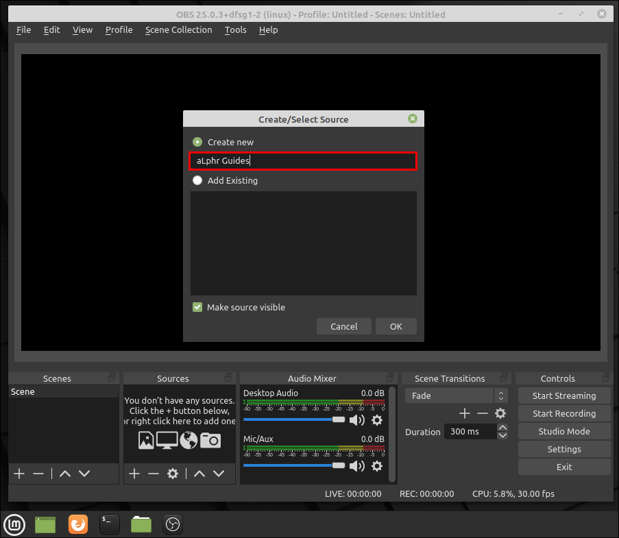- A small pop-up window will appear. Name the source by typing in the corresponding field and click “OK.”