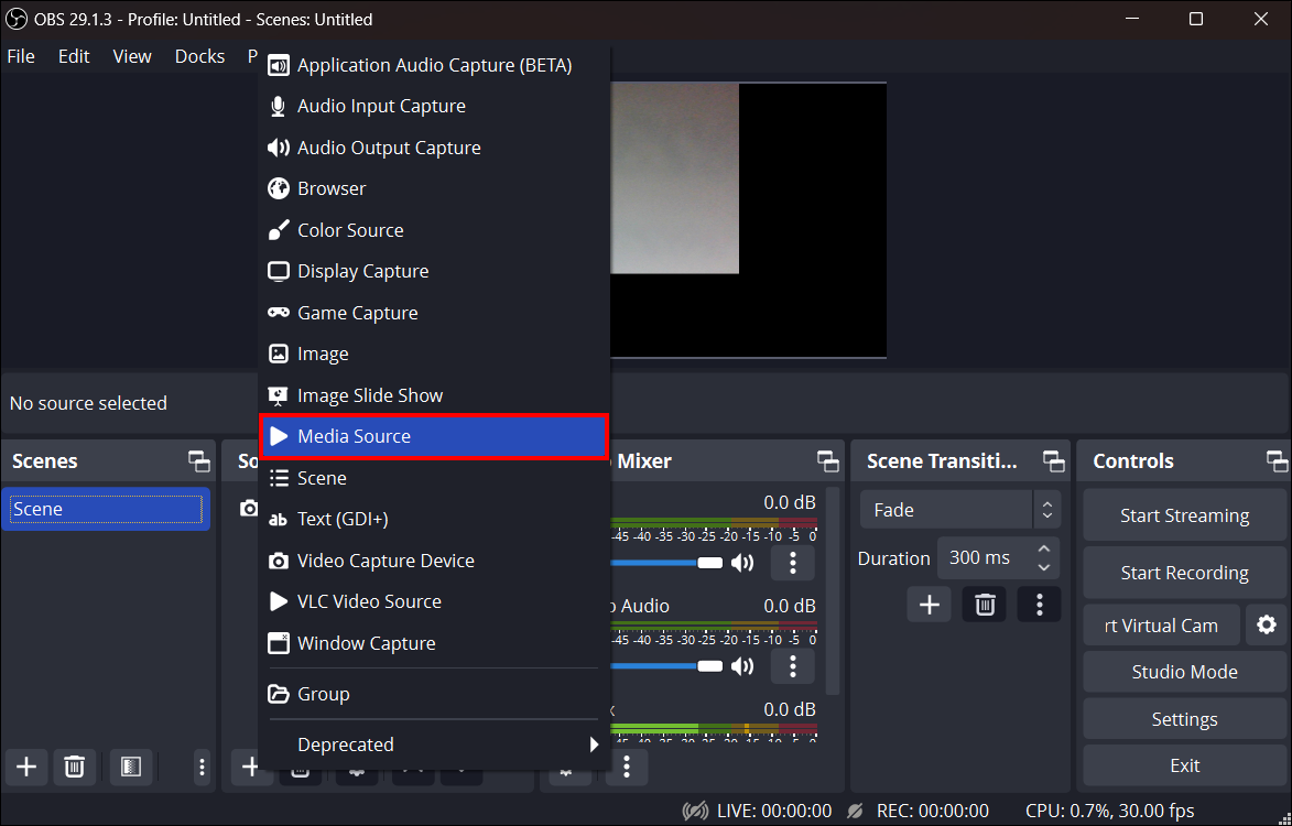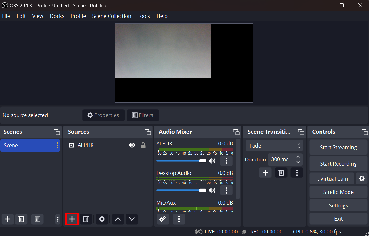 - Launch OBS on your computer and select the “+” option under the “Sources” tab.