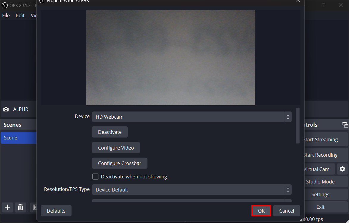 - Your camera will appear in the device field. Select it and then click “OK.”