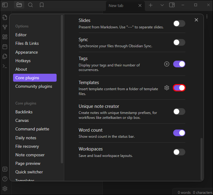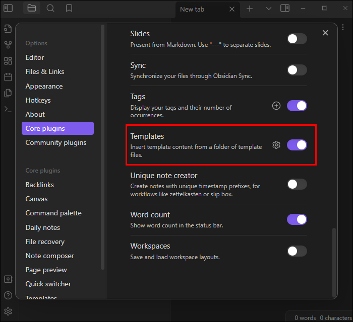 Before you use a template, you must also enable them. Follow these steps to set up Obsidian to use templates.