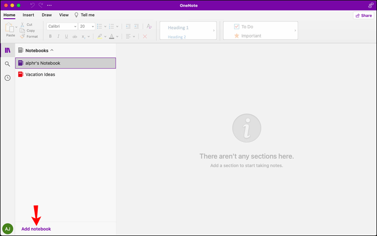 - Click on the notebook, and at the bottom of the window, click on the “+ Add section” option.
