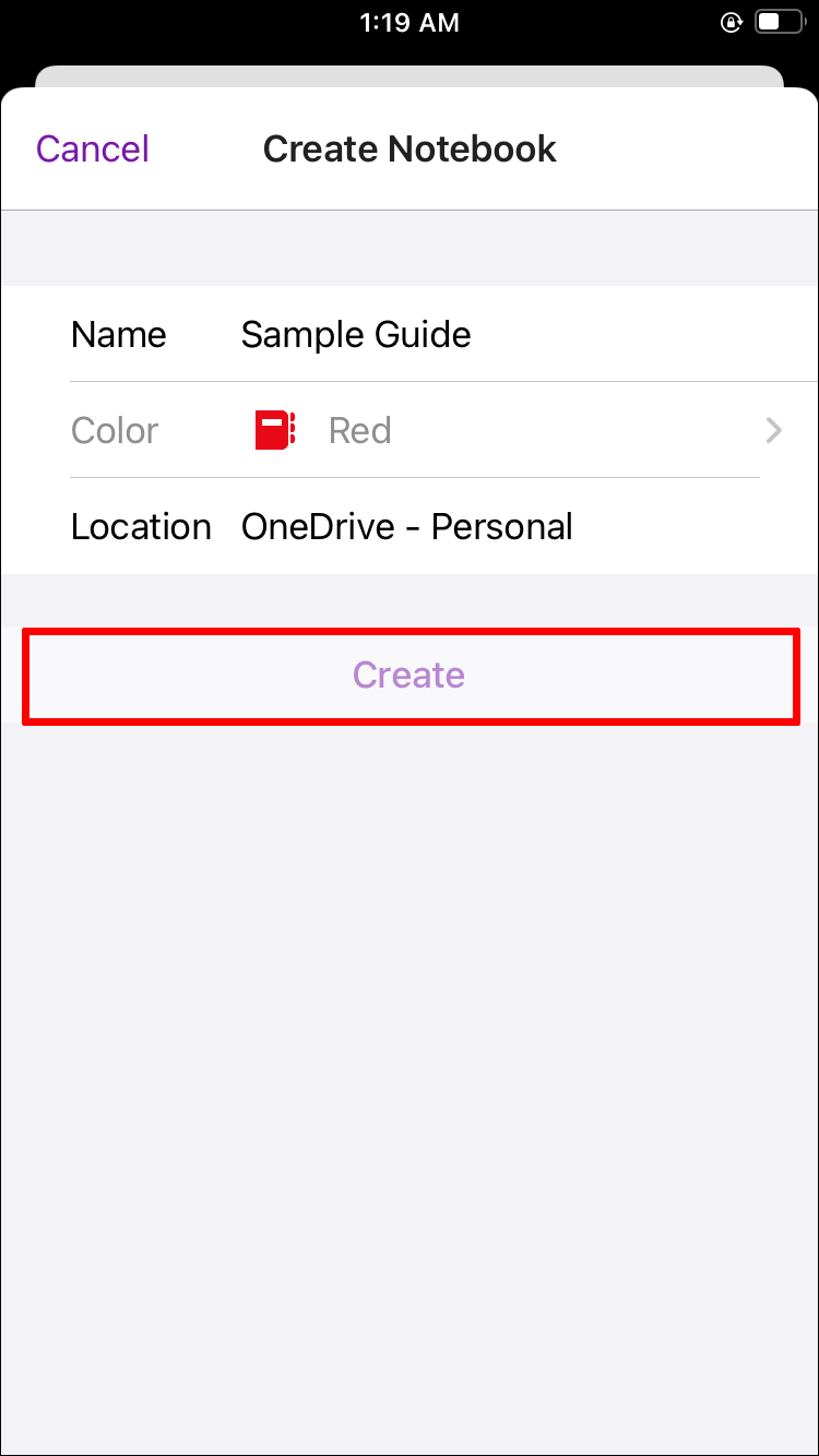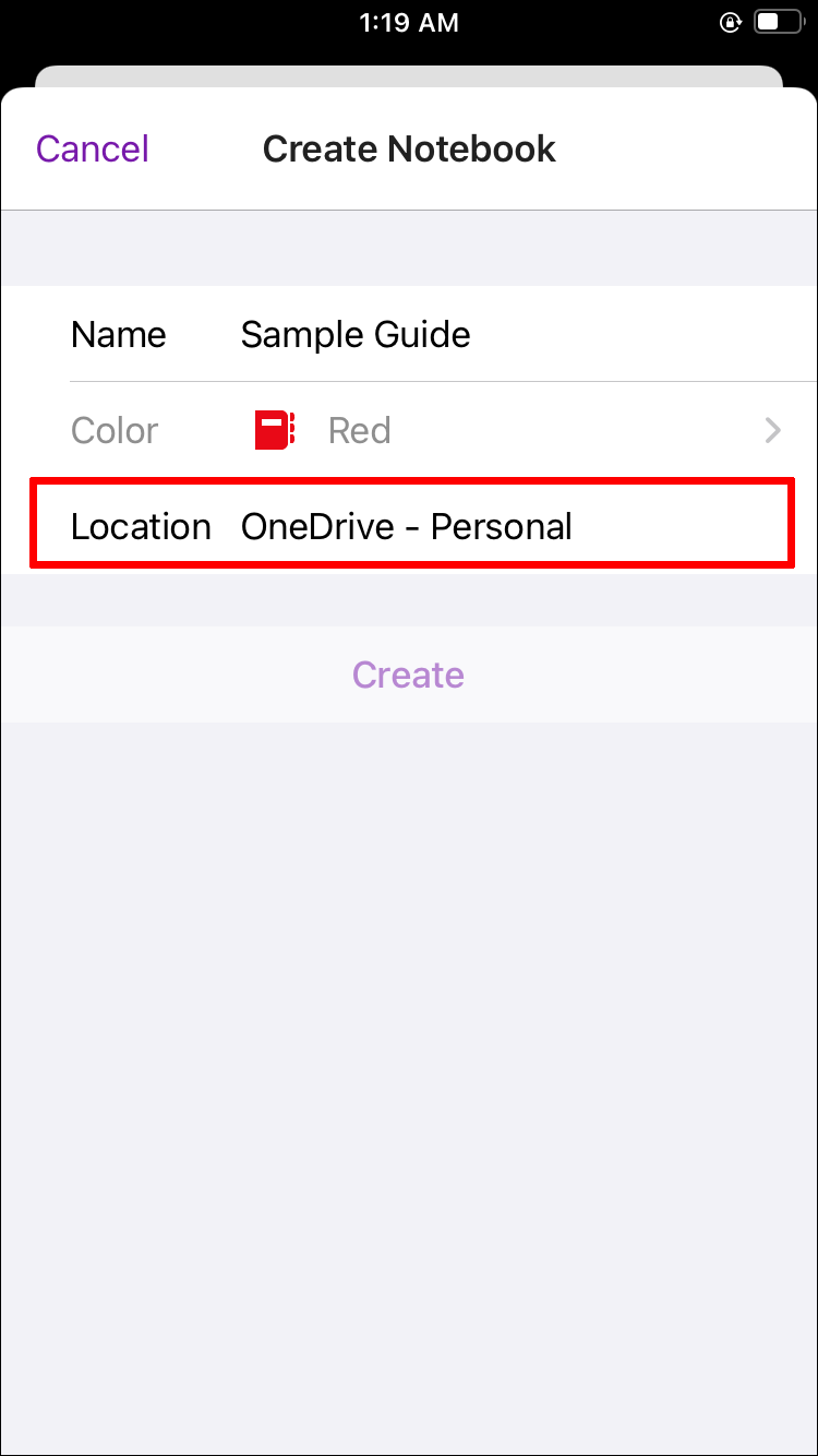 If multiple Microsoft accounts are associated with the OneNote app, you will have to select which account to use before choosing the “Create Notebook” option.
