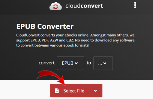 - Choose the file format to convert. Make sure the choice to Convert Epub to PDF is available and click on the red Select File button.