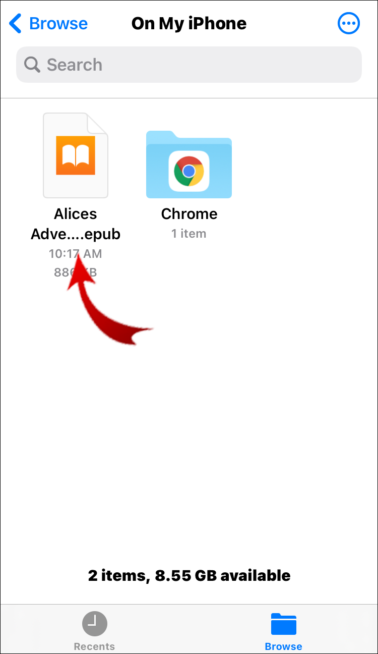 - Open the Epub file’s location by tapping on Files, then Browse.