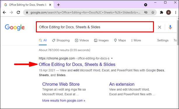 - Start typing “Office Editing for Docs, Sheets & Slides” in the search bar and click on the first result. It will take you directly to the Chrome Web store.
