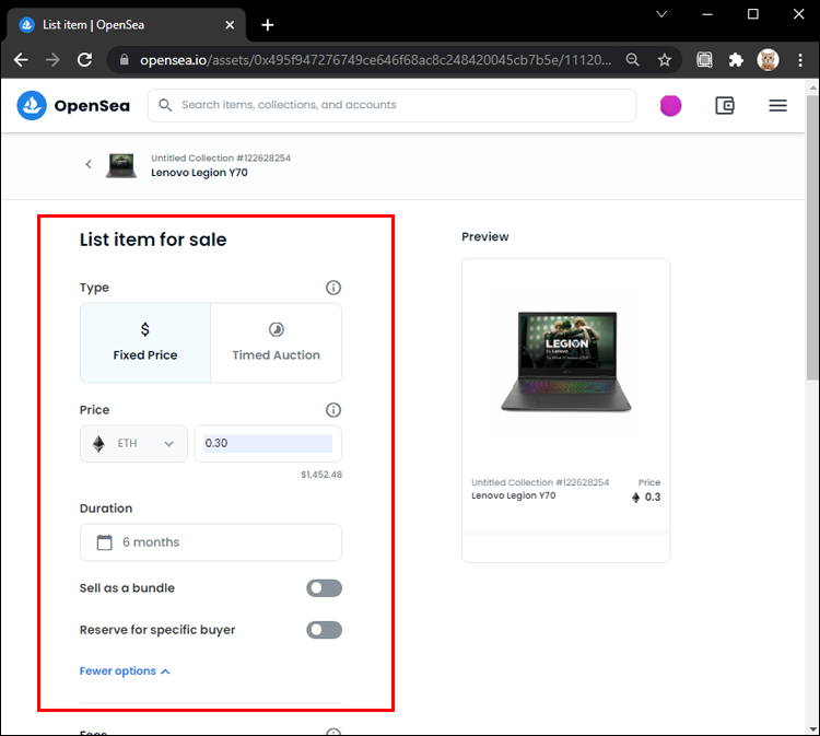 - Choose the type and price of the sale. You can set a fixed price or an auction. With the auction, enter the start price, expiration time, and price threshold. As for the duration, a sale can last for one day, three days, or a week.