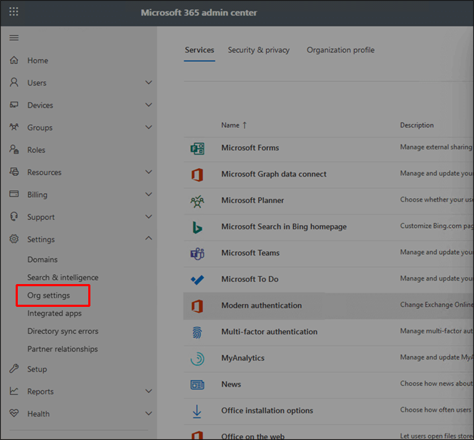 Next, ensure Modern Authentication is on in your Microsoft 365 admin center.