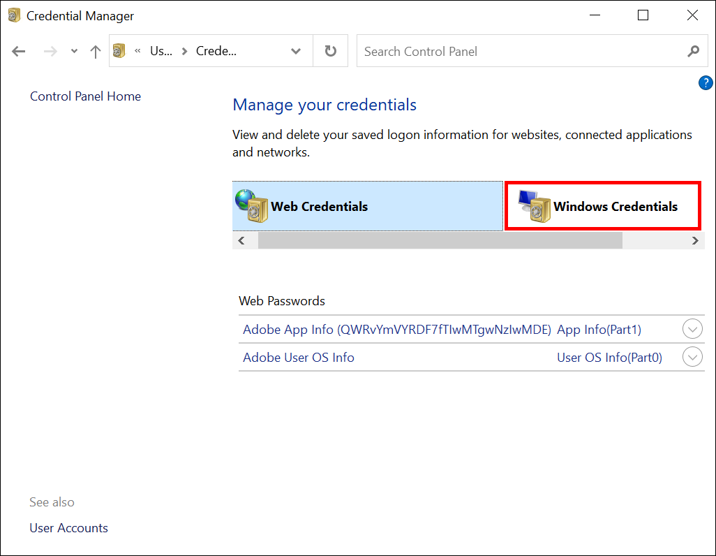 - Open your “Credential Manager” and pick “Windows Credentials.”