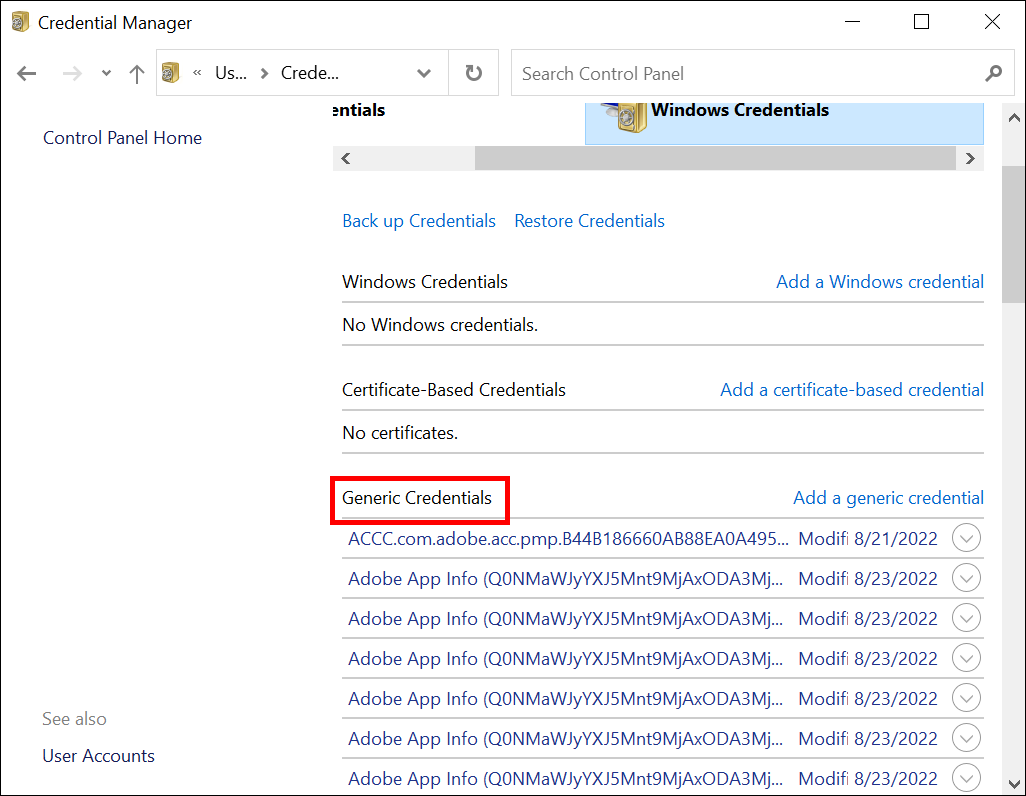 - Find your email account in the “Generic Credentials” section.