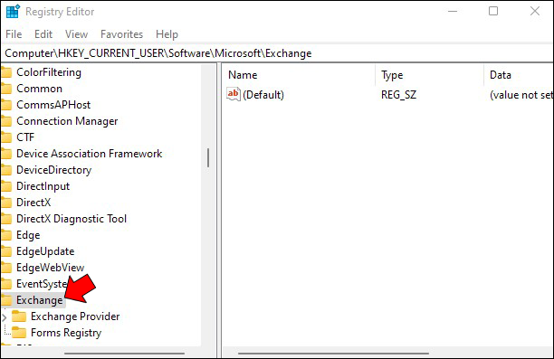 - Navigate to the following location: HKCU\Software\Microsoft\Exchange.
