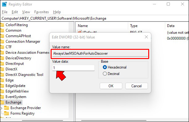 - Name it “AlwaysUseMSOAuthForAutoDiscover” and set the value to 1.