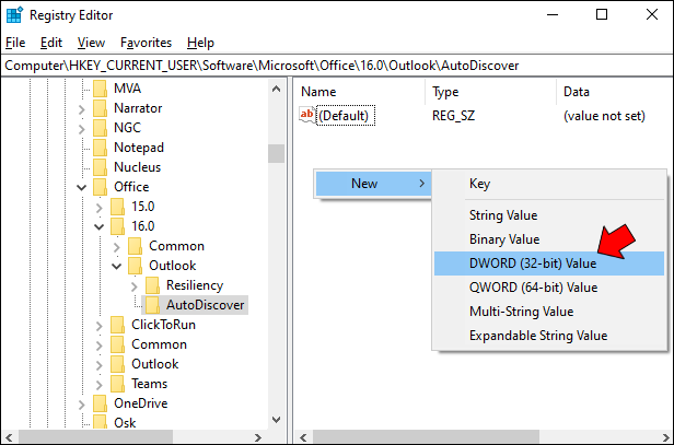 - In the “AutoDiscover” key, right-click anywhere and select “DWORD (32-bit) Value” under “New.”