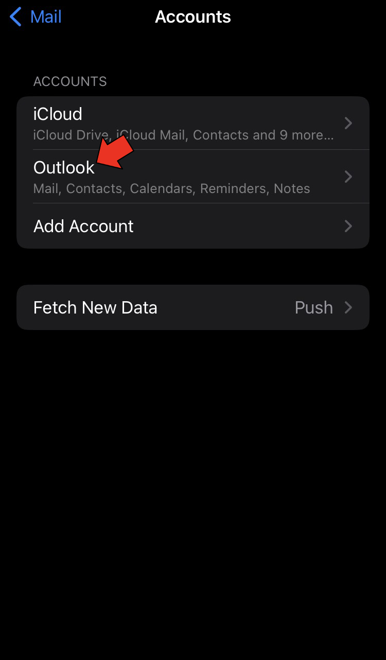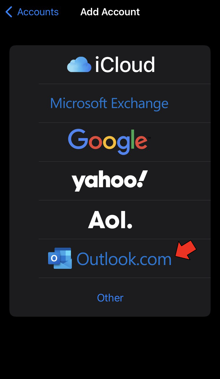 - Tap “Accounts” and select “Outlook.”