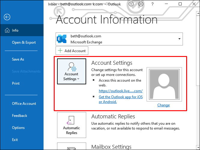 - Launch Outlook and go to your Account Settings from “File.”