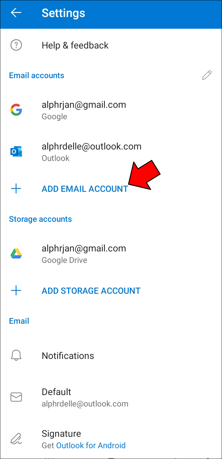 - In the Outlook Settings, tap “Add Account,” then “Add Email Account.”