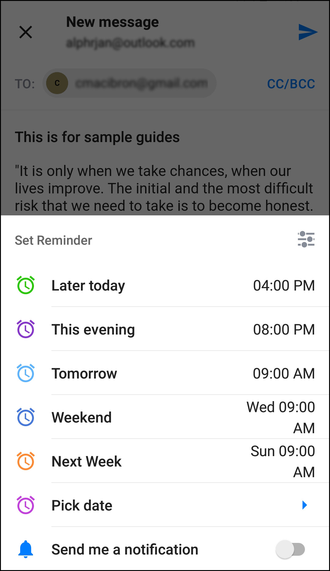 If you’re using the Outlook Android App, you won’t be able to schedule your email since this option isn’t available. You can use other third-party apps, such as Spark or Gmail, just like iOS/iPhone. Both allow you to customize when your email will be delivered.