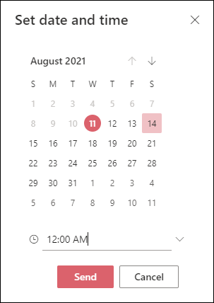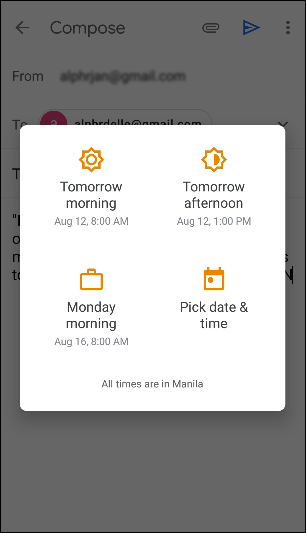 - Choose among several default options for scheduling your email: Later today, This evening, Tomorrow, or Tomorrow eve.