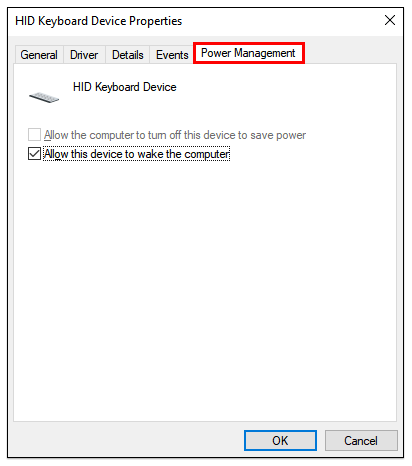 - Uncheck the “Allow this device to wake up computer” box, then click on “OK.” to save. It is now safe to close Device Manager.