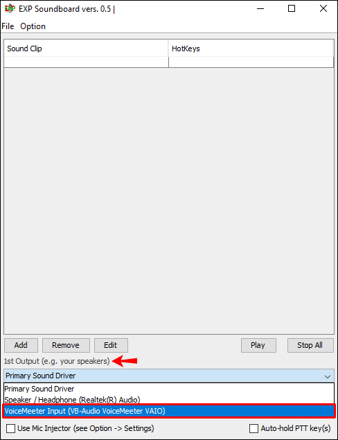 - Open EXP Soundboard. Select “VoiceMeeter Input” as the first output.