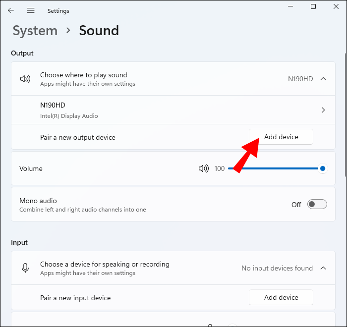 - Find the “Pair a new output device” setting and click on “Add device.”