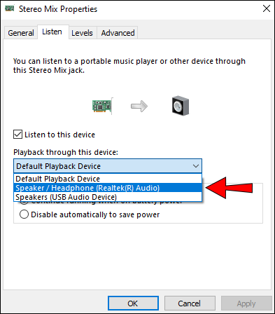 Windows will then automatically play audio from your primary audio device and the one you selected from the “Playback on this device” drop-down menu.