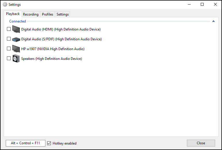 - Launch the app by clicking the “SoundSwitch” icon in the system tray or pressing the “Ctrl + Alt + F11” default shortcut.