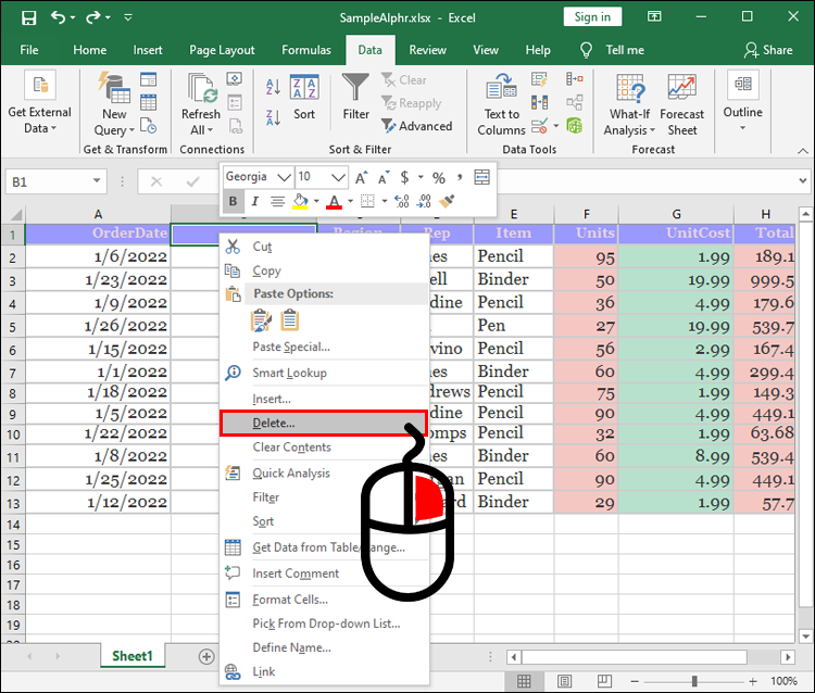 - Your columns should now be sorted. If you want to reverse the change, right-click your first row. Choose “Delete,” and you’ll go back to the default layout.
