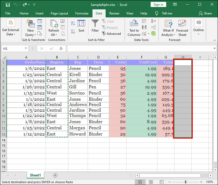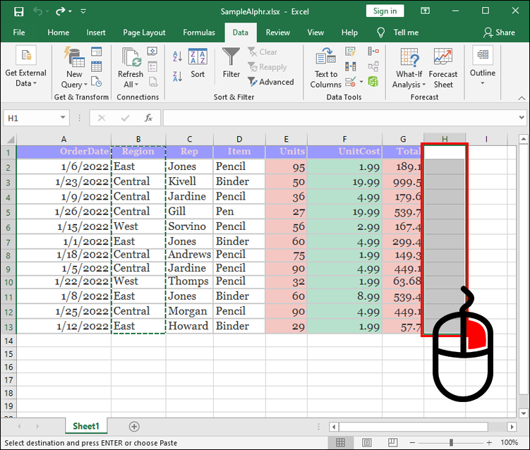 - Highlight the destination of the column and right-click on it.