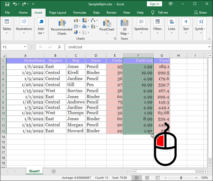 - Place the cursor atop the column that will be rearranged. The cursor should now transform into an arrow.