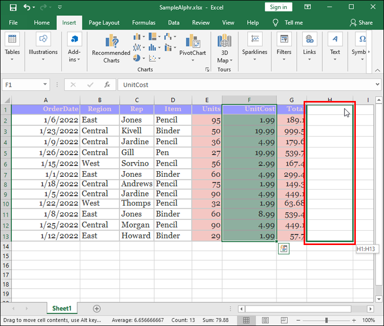 - Press the “Ctrl X” combination on the keyboard to cut your column from the current location. You should now see “marching ants” near your column, indicating it’s been removed from the original position.