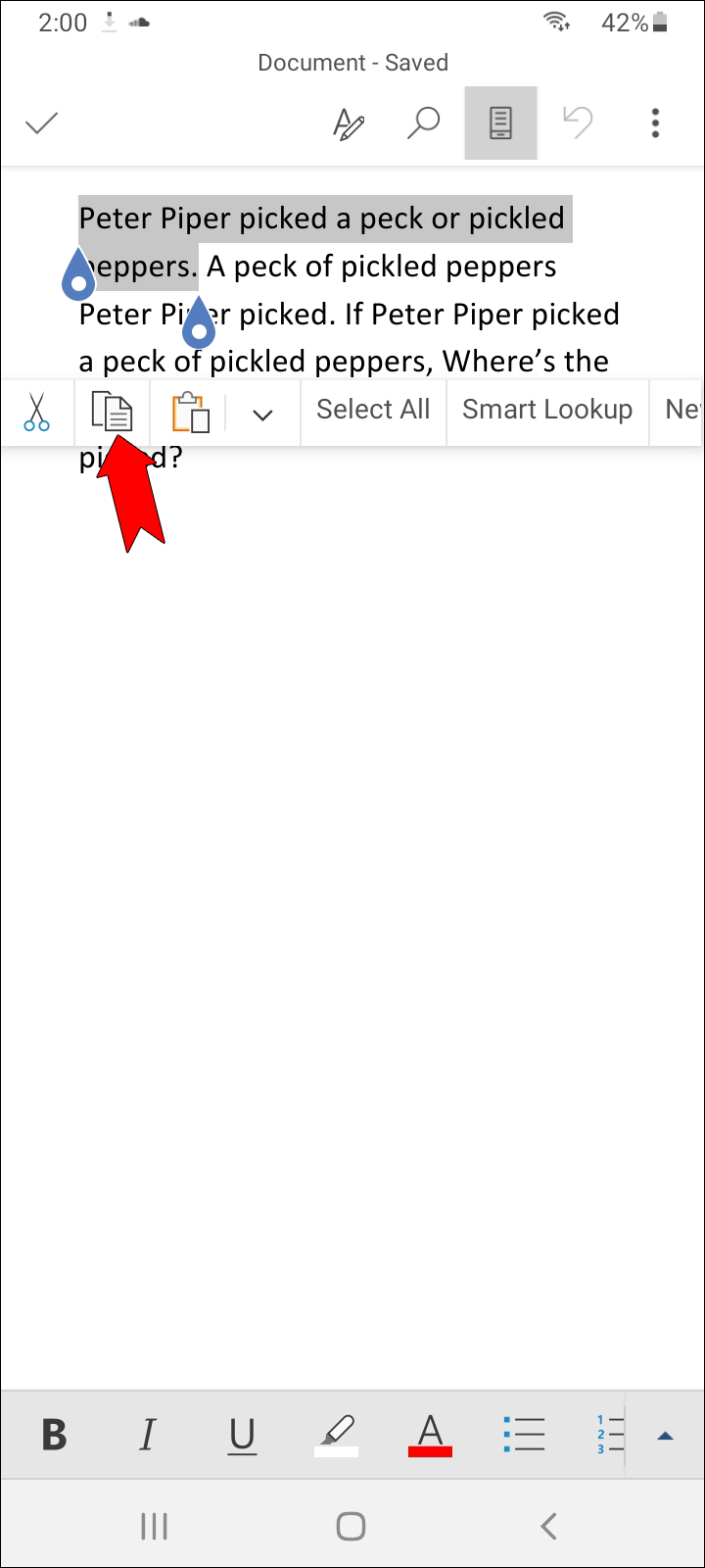 - Tap and hold anywhere in the selected text and select “Copy.”
