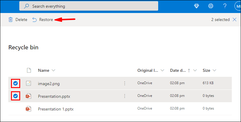 - If you want to restore multiple files, hold CTRL and drag your cursor across all the items. Then go right-click > Restore.