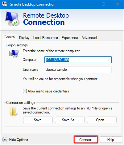- After installation, click “Connect” and enter your Ubuntu password