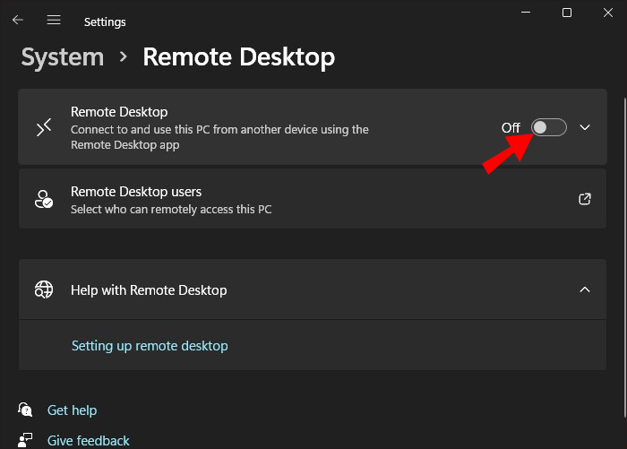 - Toggle the “Enable Remote Desktop” feature to On.