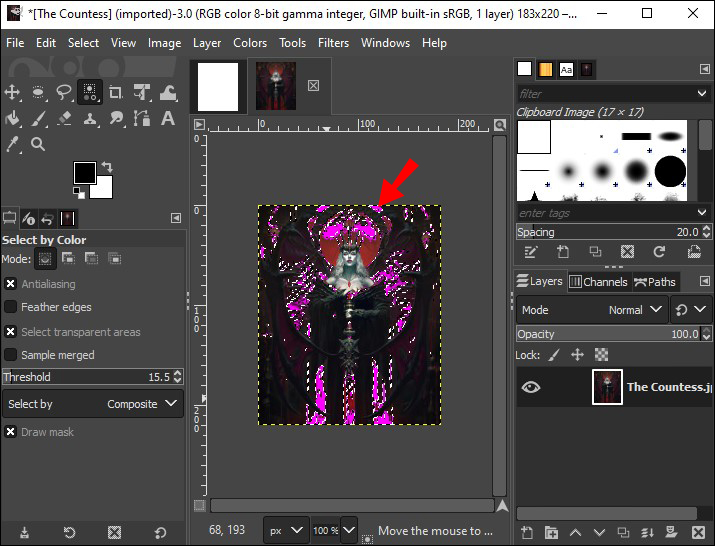 - Apply the “Fuzzy Select” tool on the image background by clicking on it until you see the desired changes.